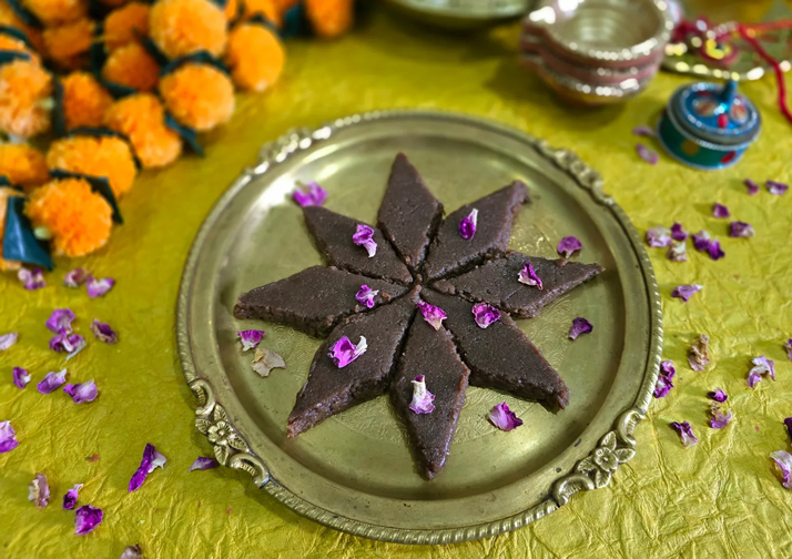 Sieve cacao powder onto this mixture and mix well. Return to the stove and cook until you are able to make a non-sticky, soft ball with the dough. Transfer the mixture to a parchment paper and leave aside, until just lukewarm. While warm, cover with another butter paper. Use a rolling pin to flatten out the dough. Cut into desired shapes. Allow to cool and transfer to an airtight container.