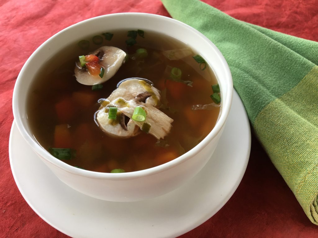 Roughly crush the lemongrass and kaffir lime leaves, to allow the juices to release. Boil the galangal, kaffir lime leaves, lemongrass and mushrooms with water in a deep pan. Add tomato and spring onions. Cook for 1 minute and turn off the heat. Add lemon juice, chilli flakes, red chilli rounds, salt and soy sauce.