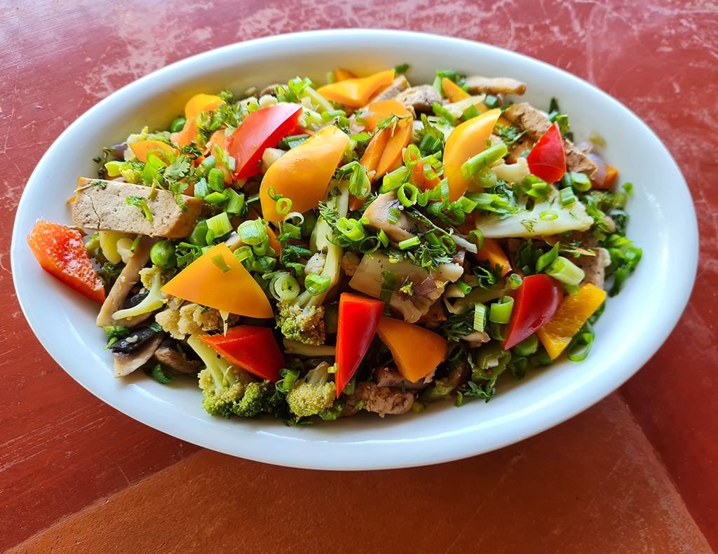 Cut the tofu into ½” chunks and coat well with the marinade. Let it marinate for 45 minutes in a bowl. Drain the tofu, saving the marinade. Heat a large pan and add the cauliflower, broccoli, carrots, onion, green pepper and tofu. Stir frequently, cooking evenly. Add the snow peas, mushrooms and green onions. Continue to stir frequently until the vegetables are cooked but still crunchy. Serve over rice, and top with the marinade.